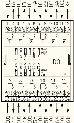 現(xiàn)場(chǎng)使用AC220V供電的三線制雙DO開(kāi)關(guān)閥門,模塊上號(hào)碼管標(biāo)號(hào)為101的全部電線均為同相火線,作為公共端進(jìn)行使用,號(hào)碼管標(biāo)號(hào)為1A/1B、2A/2B之類的電線為閥門的信號(hào)線,規(guī)定A為雙DO開(kāi)關(guān)閥的“打開(kāi)”控制信號(hào),B為雙DO開(kāi)關(guān)閥的“關(guān)閉”控制信號(hào)。在確認(rèn)控制模塊IO點(diǎn)的輸出狀態(tài)時(shí),發(fā)現(xiàn)無(wú)論軟件程序是否下發(fā)開(kāi)啟指令,雙DO補(bǔ)水閥的A信號(hào)線與101火線均處于輸出狀態(tài),B信號(hào)線與101火線受程序控制,按照程序下發(fā)的指令分別執(zhí)行“打開(kāi)”或“關(guān)閉”的動(dòng)作。為了再次判斷是閥門出現(xiàn)了故障,還是控制模塊出了問(wèn)題,摘除101火線與A信號(hào)線,測(cè)量控制模塊的IO輸出點(diǎn),發(fā)現(xiàn)模塊控制101火線與A信號(hào)線的繼電器出現(xiàn)了“常閉”鎖死狀態(tài),更換了DO-FA-12-H模塊,問(wèn)題暫時(shí)得到解決。